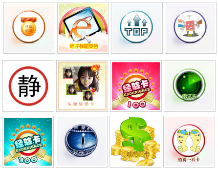 1.目前道具库包括:商城开通限量版纪念勋章、帖子标题变色卡、帖子限时置顶卡、喧嚣卡、沉寂卡、头像装饰卡、100积分经验卡、 雷达卡 、300积分经验卡、窥视卡、红包卡、值得一看卡