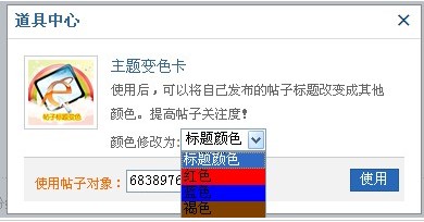 帖子标题变色卡:兑换成功后,需要在帖子详细页面中使用,使用方法:点击帖子内容右下角处红色“道具”(帖子标题变色卡)功能:帖子标题变色