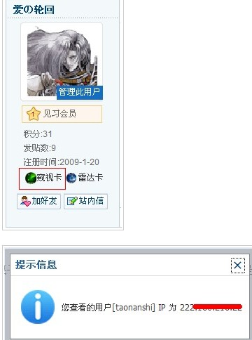 窥视卡:兑换成功后,需要在帖子详细页面中使用,使用方法:点击帖子内容右下角处红色“道具”(窥视卡)功能:可以查询发帖或回帖时,该用户的ip信息!